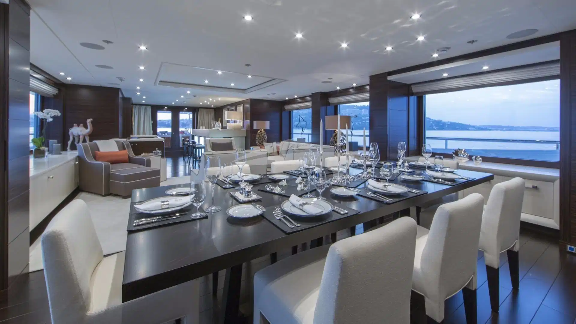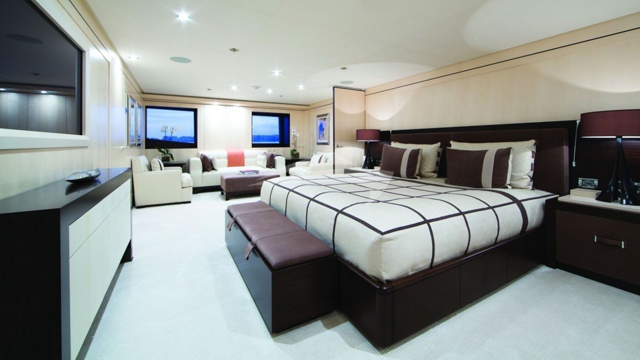 The yacht’s main salon has an elegant colour palette of grey and white which is beautifully layered with rich woods to create a warm and inviting space. Here you will find a lit-up welcome bar and sumptuous sofas and lounge chairs for relaxing. Further in is the yacht’s formal dining area where ten plush chairs surround a beautiful dining table, providing a delightful setting to enjoy the exquisite cuisine prepared by REVELRY’s onboard chefs. On the deck above, the upper lounge features a lighter colour scheme that is airy and bright, prompting relaxation. Lounge seating, a games table, and a full bar further add to the laid-back feel of this salon. The large windows that flank these impressive spaces provide abundant views and ample natural light.Accommodation-wise REVELRY features an impressive main deck master suite that offers a private office, lounge, marble-clad ensuite bathroom, and a generous walk-in wardrobe.